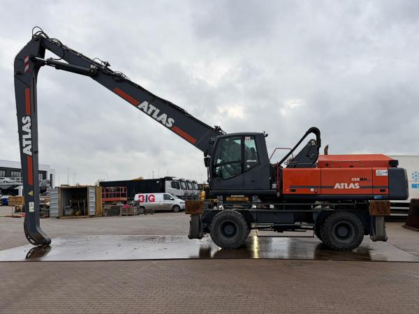 This Atlas 350MH material handler is in good working condition and equipped for heavy-duty industrial loading, recycling, and scrap-handling activities.