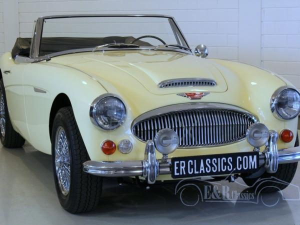 This 1967 Austin Healey 3000 MK3 is fully restored and is in very beautiful condition. The beautiful yellow body has chrome linings, beautiful Carello lights and chrome wire wheels. The wooden dashboard looks chic and has chrome clocks. The car has black leather seats. The Austin Healey produces 170 HP and has the popular overdrive, which makes driving this MK3 even more pleasant. The beautiful sporty sound is great for the fans. So, a fabulous Austin-Healey 3000 MK3