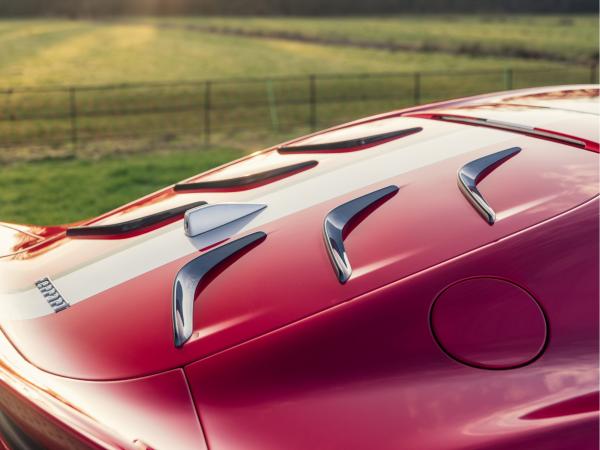 Inside, the mood turns focused and uncompromising. A full Nero Alcantara interior wraps the cockpit in a motorsport atmosphere, broken only by carbon fibre accents and the aluminium rev counter front and centre. Racing squared seats, lifted for usability but unfiltered in intent, anchor the driver low and forward. The tricolour stripe on the steering wheel is a subtle nod to heritage, while modern essentials, passenger display, cameras and CarPlay are seamlessly integrated without softening the experience.