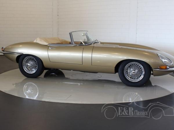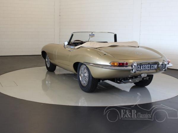 This Jaguar E-Type is fully restored in 2017 in our workshop. The Jaguar is provided with new Opalescent Golden Sand paint such as at the original delivery in 1965. The impressive interior has beige leather upholstery of the highest quality. The original matching numbers 4235 CC engine is fully revised. Full photoreport of the restoration is present. The Jaguar Heritage Certificate is present too.