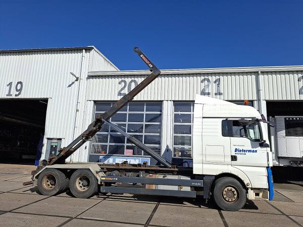Aantal Assen: 3, Configuratie: 6x2, Laadvermogen: 15780 kg, Eigen gewicht: 12220 kg, Totaalgewicht: 28000 kg, Diesel inhoud totaal: 450 liter, Aanhangwagen kopp., Trekgewicht ongeremd: 750 kg, Dikte koppelingspen: 40 DIN, Schotel type: Fixed, Aantal sperren: 1, Centrale smering, Vering type: luchtvering, Soort cabine: Korte cabine, Cruise control, Tachograaf, Digitale tachograaf, Airconditioning, Standkachel, Elektrische ramen, Elektrische spiegels, Radio/cassette, Kleur: Meerkleurig, Verwarmde spiegels, Soort lampen: Halogeen, Climatecontrol, Stoelverwarming, Zwaailichten, Motorvermogen: 324 Kw (434 Hp), Brandstof: diesel, Euro: 5, Soort versnellingsbak: AS-tronic, Merk versnellingsbak: ZF, Versnellingen: 12, Stuurbekrachtiging, ABS (Anti Blokkeer Systeem), ASR (Anti Slip Regeling), PTO, PTO soort: 1, Start accu, Bouwjaar opbouw: 2003, Lengte systeem: 595 cm, Merken haakarmsysteem en kabelsysteem: Multilift, systeemtype: XR21S61 RPCO - LA, Pomp, haakarmhoogte: 130, Centrale vergrendeling, Zitplaatsen: 2, Stoelopstelling: 1+1, Stoelbekleding: stof, Stoel verstelling: Handmatig