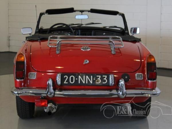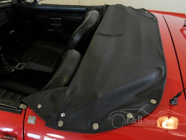 This MGB roadster was delivered in 1975 in beautiful Flame Red paint. The car has new chrome wire wheels and a marvelous luggagerack. The car drives great and has a revised gearbox with the popular overdrive option. The interior has black leatherette with comfortable seats and the original dashboard with chrome clocks. The MG is a perfect car for rides and is ready for lots of driving pleasure.