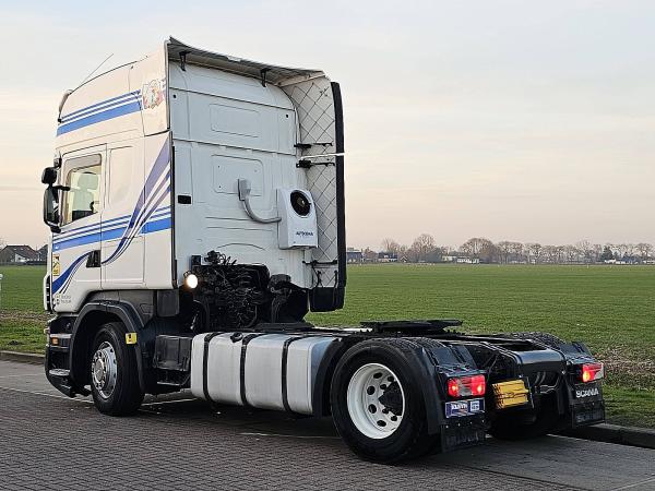 Aantal Assen: 2, Configuratie: 4x2, Eigen gewicht: 8250 kg, Totaalgewicht: 19000 kg, Diesel inhoud totaal: 1400 liter, 2e dieseltank, Schotelhoogte: 109 cm, Schotel type: Fixed, Aantal sperren: 1, Vering type: luchtvering, Soort cabine: Topline, Cruise control, Tachograaf, Digitale tachograaf, Airconditioning, Stand airco, Standkachel, Elektrische ramen, Elektrische spiegels, Radio/cassette, Kleur: Wit, Verwarmde spiegels, Soort lampen: Halogeen, Climatecontrol, Zwaailichten, Motorvermogen: 324 Kw (434 Hp), Brandstof: diesel, Euro: 4, Soort versnellingsbak: Opti-cruise, Merk versnellingsbak: Scania, Versnellingen: 12, Koppelingspedaal, Extra remsysteem, Merk retarder: Scania, Stuurbekrachtiging, ABS (Anti Blokkeer Systeem), ASR (Anti Slip Regeling), Start accu, Centrale vergrendeling, Stoelopstelling: 1+1, Stoelbekleding: stof, Stoel verstelling: Handmatig