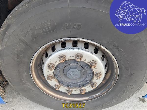 Achteras: Bandenmaat: 315/80 R22.5; Dubbellucht; Bandenprofiel linksbinnen: 5 mm; Bandenprofiel linksbuiten: 5 mm; Bandenprofiel rechtsbinnen: 3 mm; Bandenprofiel rechtsbuiten: 3 mm; Vering: luchtvering