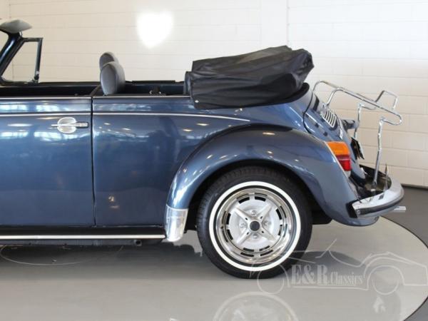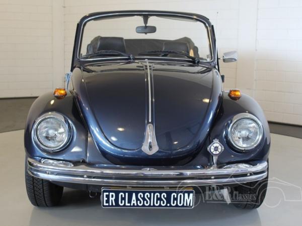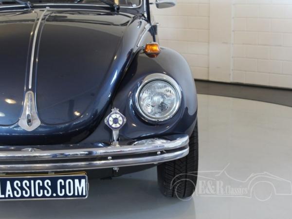 This 1974 Volkswagen Beetle has a fabulous blue paint with a lot of chrome details. The interior has the original dashboard with a big combi clock and black leatherette upholstery. The Volkswagen has an automatic gearbox. The Beetle convertible is a very popular classic car which drives great.
