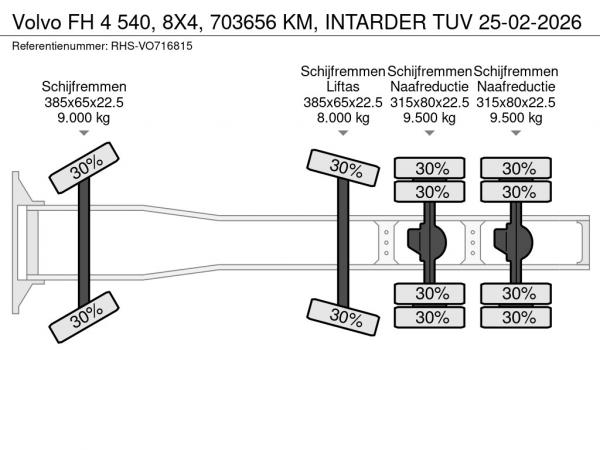 Vooras: Bandenmaat: 385x65x22.5; Max. aslast: 9000 kg; Meesturend; Bandenprofiel links: 30%; Bandenprofiel rechts: 30%
