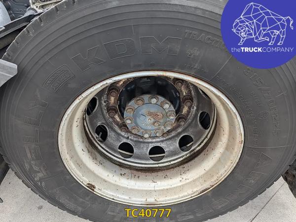 Achteras: Bandenmaat: 315/70 R22.5; Dubbellucht; Bandenprofiel linksbinnen: 3 mm; Bandenprofiel linksbuiten: 3 mm; Bandenprofiel rechtsbinnen: 4 mm; Bandenprofiel rechtsbuiten: 2 mm; Vering: luchtvering