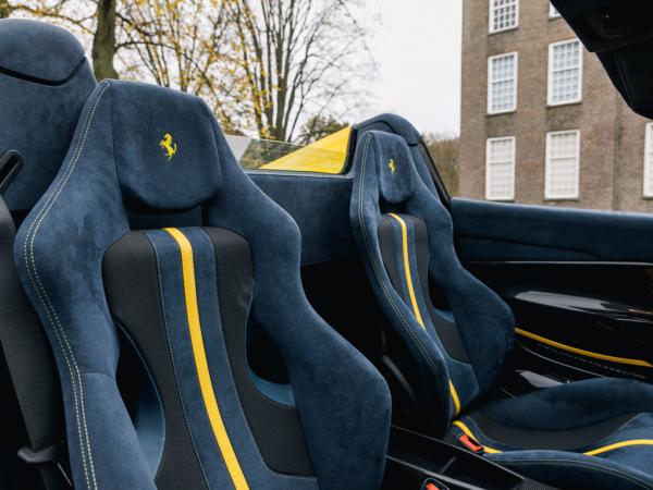 The interior is equally stunning, featuring Blu Alcantara with Giallo details, including the Cavallino stitched on the headrests and yellow stitching throughout.