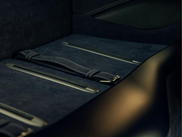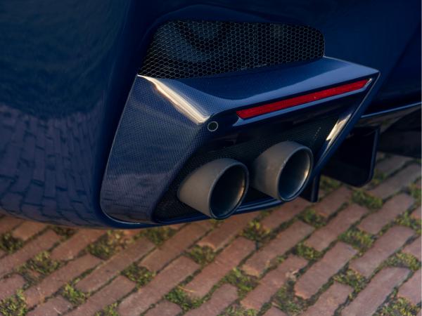 The exterior detailing is purposeful and restrained. Glossy Blue Carbon elements add depth rather than drama, while satin aluminium badges and scripts underscore the car’s motorsport intent. Subtle Scotland Blue accents on the bonnet and mirrors frame the design, and matt Racing Grey wheels paired with blue brake calipers ground the car visually. Leaving the engine bay carbon in its natural finish feels like a nod to authenticity; performance first, ornament second.