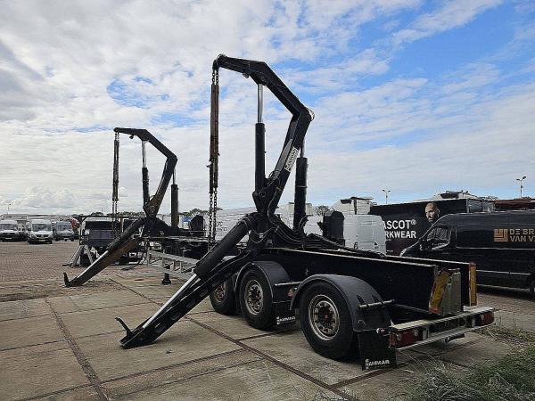 Aantal Assen: 3, Laadvermogen: 36160 kg, Eigen gewicht: 8840 kg, Totaalgewicht: 45000 kg, Soort chassis: Volledig chassis, Materiaal chassis: staal, Kingpin afmeting: 2 inch, Vering type: vollucht, ABS (Anti Blokkeer Systeem), EBS, Bouwjaar opbouw: 2008, Merk as: SAF, Kraan, CONTAINER SIDE LOADER 2X 20 1X 40