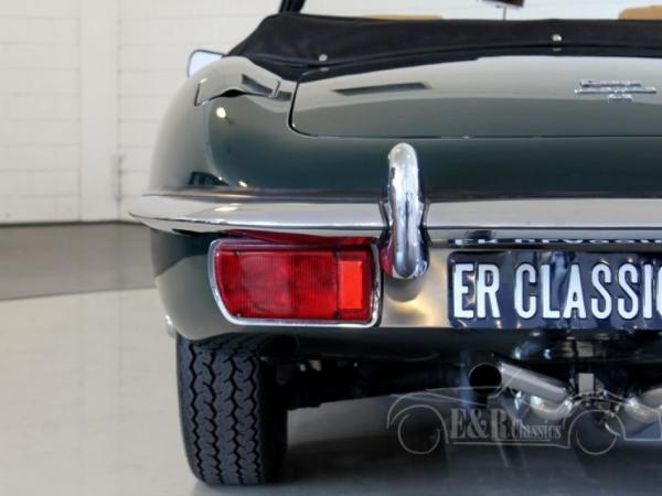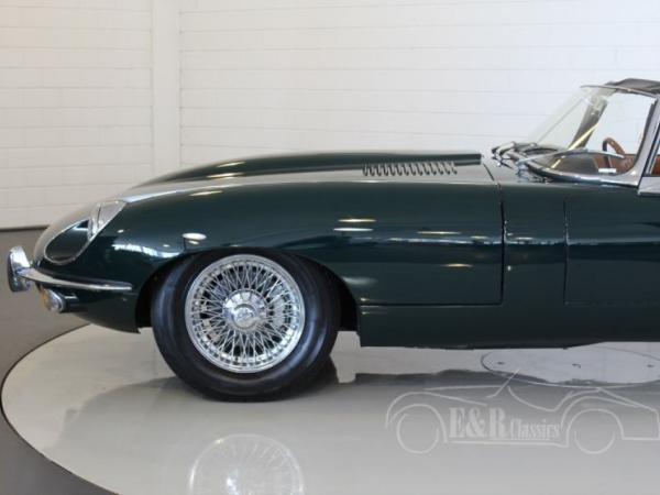 This Jaguar E-Type Series 2 cabriolet was built in 1969. In the meantime this Jaguar is restored and provided with a beautiful British Racing Green paint and fabulous chrome wire wheels. The Jaguar drives great and is powered by the original matching numbers 6 cyl engine. The interior of the Jaguar has beige leather and is very comfortable. The dashboard has the beautiful original wooden steering wheel. This fabulous E-Type drives great and is ready for lots of driving fun.