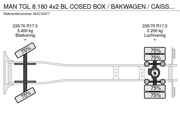 MAN (2012) MAN TGL 8.180 4x2 BL COSED BOX / BAKWAGEN / CAISSE FERMEE - *184.000km* - 3 SEATER - EURO 5 - AIR SUSPENSION - BOX 6m00 x 2m49 x 2m38 - BE TRUCK MJC12477