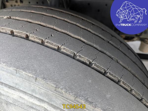 Achteras: Bandenmaat: 315/80 R22.5; Dubbellucht; Bandenprofiel linksbinnen: 12 mm; Bandenprofiel linksbuiten: 6 mm; Bandenprofiel rechtsbinnen: 9 mm; Bandenprofiel rechtsbuiten: 9 mm; Vering: luchtvering