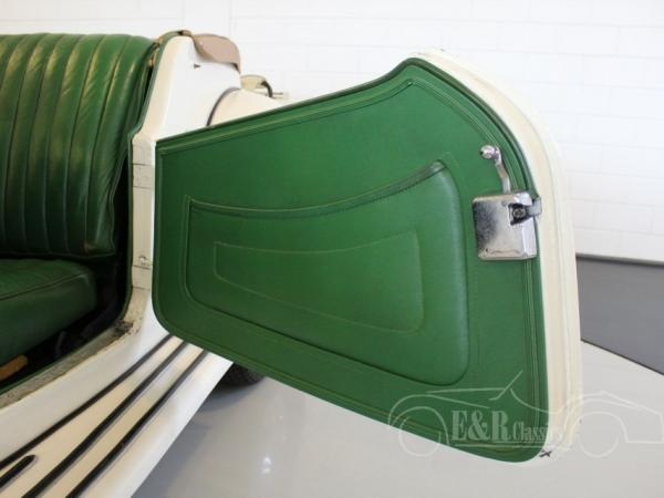 This MG TD II was built on april 22nd 1952. The car has paint in the colour Old English White with green leather interior. This is a marvellous combination with the beautiful chrome and the beige cloth soft top. The car has a 4 cyl engine connected to the 4 speed manual gearbox. The car drives great.