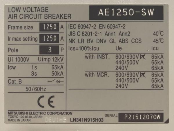 MITSUBISHI (2023) Mitsubishi Circuit breaker 1250A - AE1250-SW 3P - DPX-12648