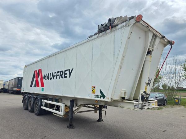 Semi-remorque benne Stas à 3 essieux avec essieux SAF , freins à disque , suspension pneumatique et essieu relevable .