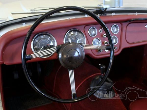 This Triumph TR2 was originally delivered in France in 1954. The early TR series were recognizable by the longer doors and the car hood with release cable. This Triumph was fully restored by its former owner and provided with beautiful new paint. The interior has red leather and is in fabulous condition. Even the dashboard with chrome clocks is refurbished with leather. The original 1991 CC engine has 91 HP and drives great. The Triumph TR2 is a rare classic car and a very popular collector’s item.