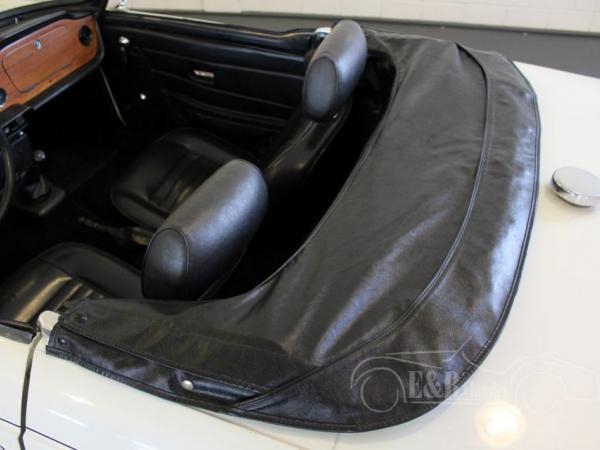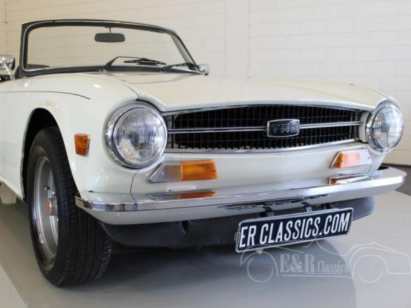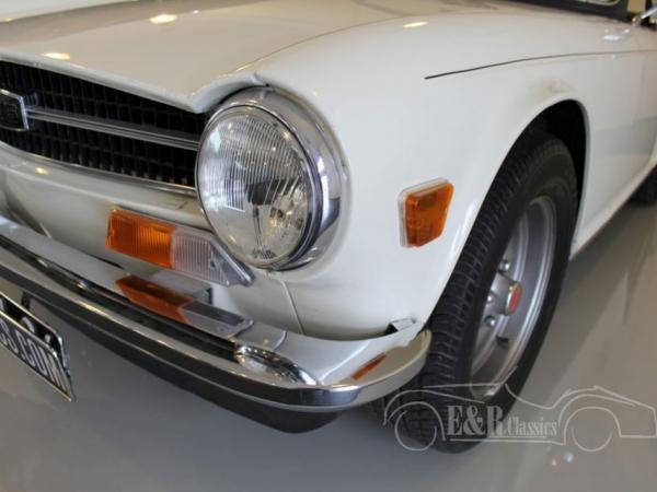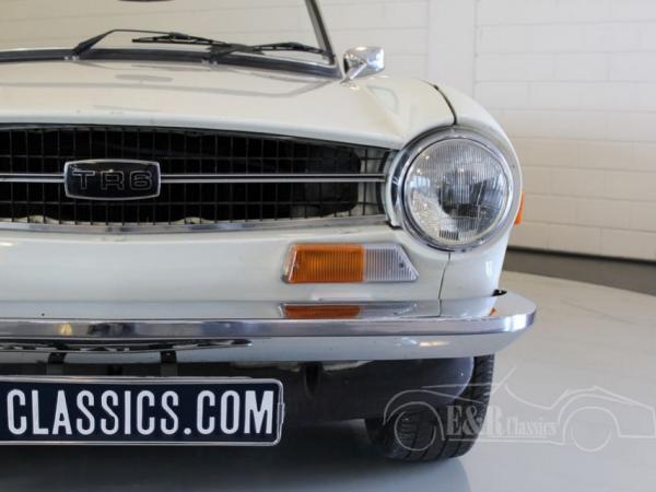 This Triumph was delivered in 1973 with white paint (Triumph Pure White) and original TR6 wheels. The paint has some traces of use. The powerful injection engine is in good condition and is easy to handle thanks to the manual gearbox with optional overdrive. The Triumph drives very well and the black leatherette seats are very comfortable. The interior has the original wooden dashboard with original TR 6 steering wheel. When you are looking for a well driving TR6 Pi than this Triumph is a good choice.