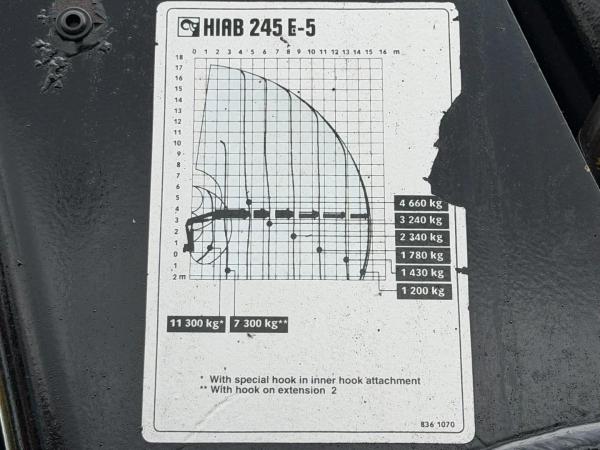 Kran: HIAB 245 E-5 + JIB 65 X-3 + 2ME, Baujahr 2003, hinten am Fahrgestell