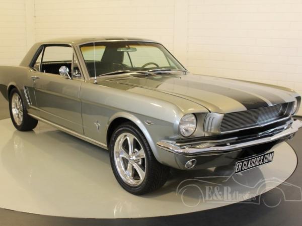 This is a 1965 Ford Mustang coupe with C-Code V8. The car has the Shelby/Eleanor colour combination of anthracite grey with black striping. The combination with the special grille and wheels makes this a real muscle car. The car also has the original automatic transmission, black pony interior and wooden steering wheel.