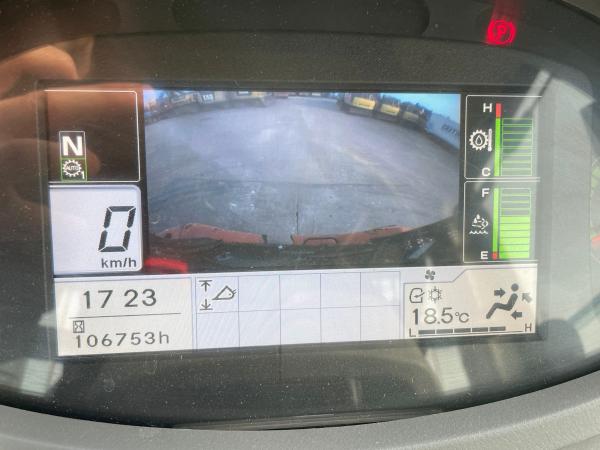 The loader is equipped with air conditioning, a rear-view camera, and comes with a bucket attached, making it ready for immediate operation.