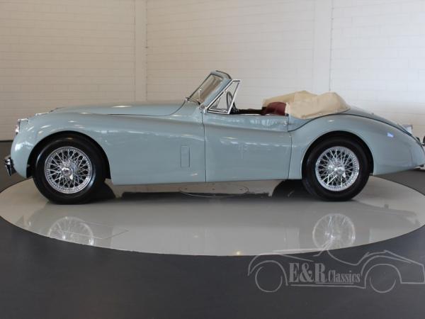 This is a marvellous 1954 Jaguar XK 120 Drop Head Coupe in the Special Equipment version with matching numbers engine. This Jaguar was fully restored in Holland. The car has paint in colour Birch Grey with burgundy red leather interior and a beige soft top. A fabulous combination on this iconic English classic car.