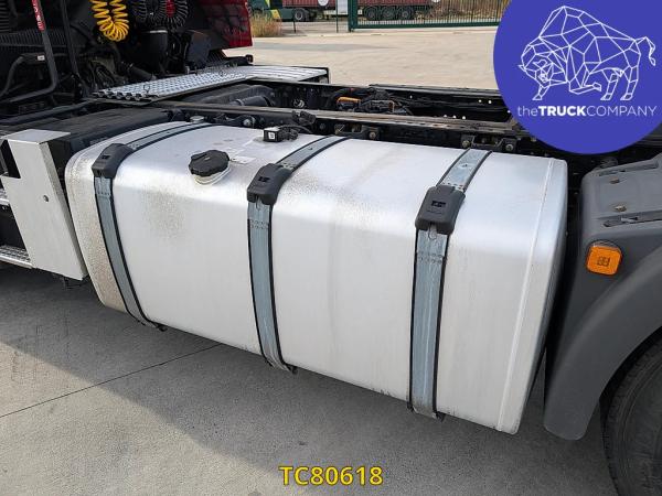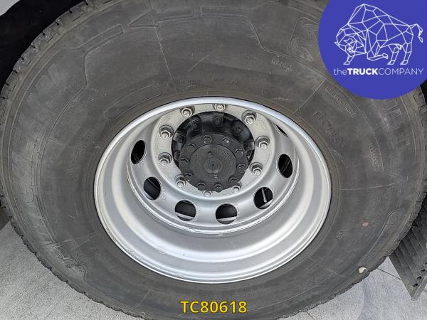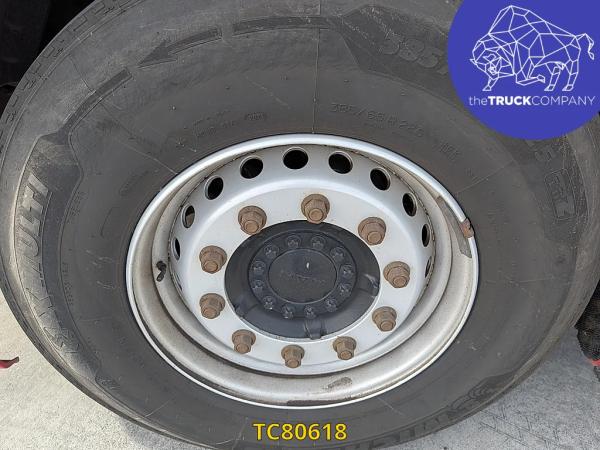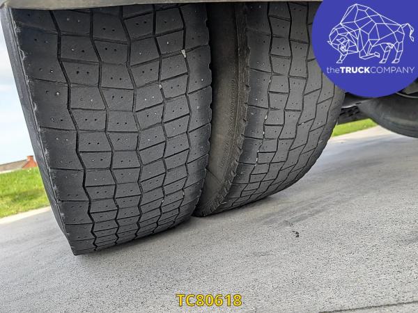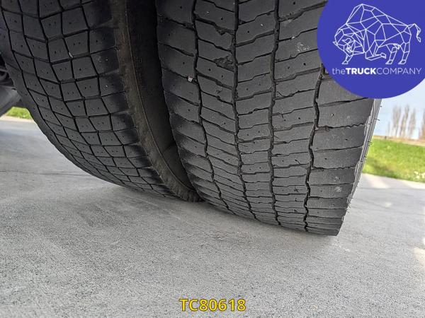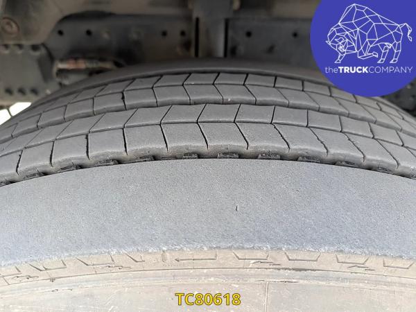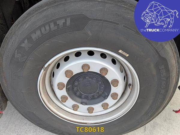 Achteras: Bandenmaat: 315/80 R22.5; Dubbellucht; Bandenprofiel linksbinnen: 4 mm; Bandenprofiel linksbuiten: 7 mm; Bandenprofiel rechtsbinnen: 3 mm; Bandenprofiel rechtsbuiten: 4 mm; Remmen: schijfremmen; Vering: luchtvering