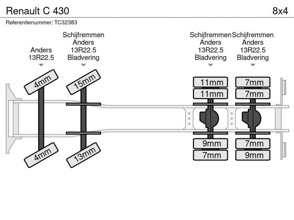 Achteras 1: Dubbellucht; Bandenprofiel linksbinnen: 9 mm; Bandenprofiel linksbuiten: 7 mm; Bandenprofiel rechtsbinnen: 11 mm; Bandenprofiel rechtsbuiten: 11 mm; Remmen: schijfremmen; Vering: bladvering