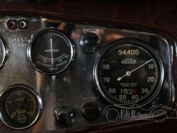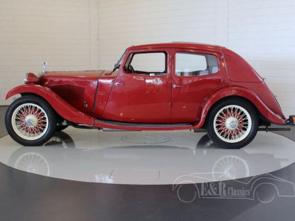 This is a 1934 Riley Kestrel in the Saloonversion. The car is in a very beautiful original condition with nice patina. The red paint is a great combination with the wire wheels in colour beige. The car has leather upholstery and the interior is finished with beautiful wood parts and ofcourse the fabulous big sunroof. In the front there is the famous ‘Nine Type engine’, a 4 cyl engine with double carburators. This is a very rare Saloon version.