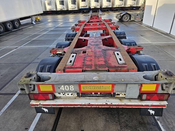 Aantal Assen: 3, Eigen gewicht: 5600 kg, Totaalgewicht: 39000 kg, Soort chassis: Volledig chassis, Materiaal chassis: staal, Kingpin afmeting: 2 inch, Vering type: vollucht, ABS (Anti Blokkeer Systeem), EBS, Bouwjaar opbouw: 2012, Twistlocks: 2x20 + 1x30 + 1x40 + 1x45 high cube, Uitschuifbare chassis: Voorkant / achter, Merk as: SCHMITZ