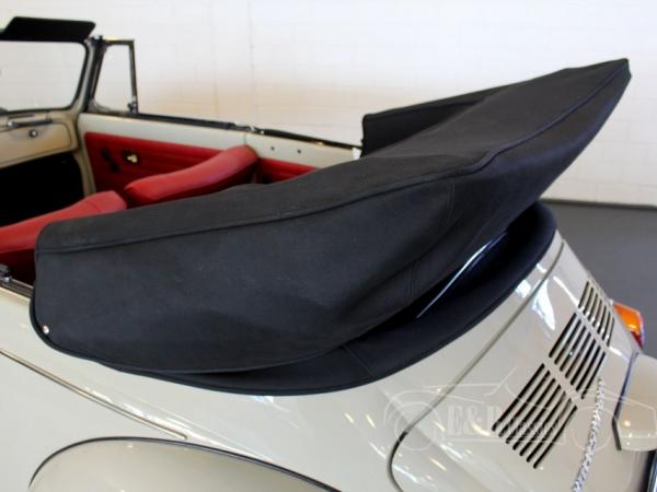 This fully restored Volkswagen Beetle 1500 has marvellous Savana Beige paint with a black mohair soft top. The convertible has the original and fully revised 1500 engine. The car also has disc brakes. The interior has comfortable red leather upholstery with the dashboard in the beige paint colour, a really great combination.