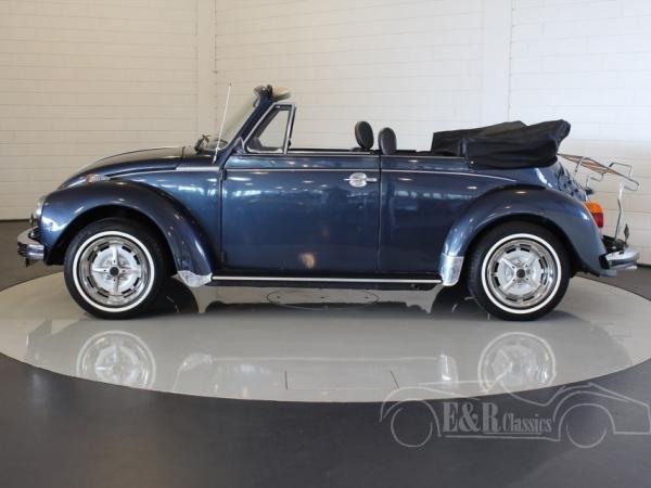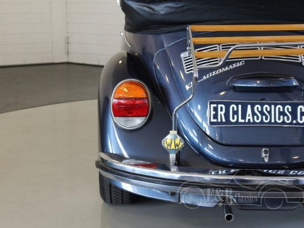 This 1974 Volkswagen Beetle has a fabulous blue paint with a lot of chrome details. The interior has the original dashboard with a big combi clock and black leatherette upholstery. The Volkswagen has an automatic gearbox. The Beetle convertible is a very popular classic car which drives great.