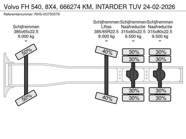 Achteras 2: Bandenmaat: 315x80x22.5; Dubbellucht; Max. aslast: 9500 kg; Bandenprofiel linksbinnen: 30%; Bandenprofiel linksbuiten: 30%; Bandenprofiel rechtsbinnen: 30%; Bandenprofiel rechtsbuiten: 30%; Reductie: naafreductie