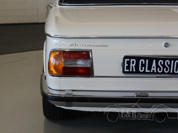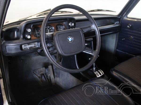 This is a 1974 BMW 2002 in the original and popular couleur Chamonix Weiss with blue leatherette interior and beautiful alloy wheels. Both the interior and exterior are in very beautiful condition. The car has the original matching numbers engine and automatic gearbox.
