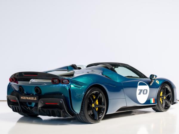 The Blu Capri 4-layer paint, unique to this model, is set off by a historic two-tone Nero roof (BIC2) and a hand-applied livery in Acquamarina Blu, racing across the bonnet, doors, and spoiler. A bold Bianco King circle on each door with the number 70 echoes Ferrari’s racing legacy, while the Italian and Dutch flag motifs at the door sills hint at the global passion Ferrari inspires.