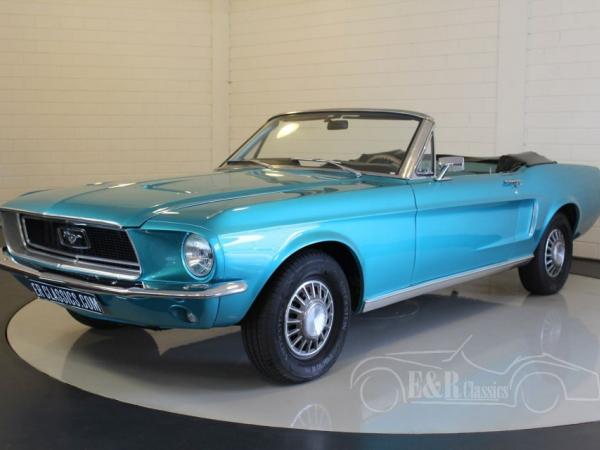 In 1968 delivered Ford Mustang cabriolet in the beautiful Brittany Blue paint with original chrome.The car drives great thanks to the V8 engine and the optional power steering. The car has a black leatherette power top. The interior has blue leatherette and dashboard with aluminium details and wooden steering wheel.