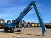 The machine is equipped with a long reach configuration, making it ideal for scrap handling, recycling, port operations, and bulk material applications. The air-conditioned cabin ensures operator comfort during long working shifts.