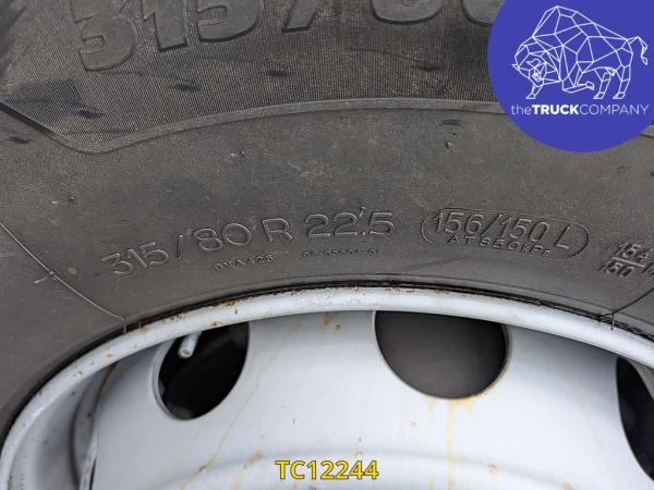 Vooras: Bandenmaat: 315/80 R22.5; Meesturend; Bandenprofiel links: 5 mm; Bandenprofiel rechts: 9 mm; Vering: bladvering