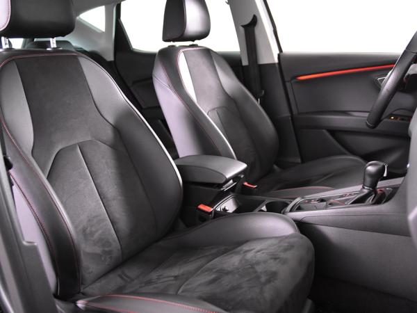 In deze Leon vind je niet alleen schakelaars op het stuur om het audio-installatiesysteem te bedienen en het navigatiesysteem, maar er is ook spraakbediening. Automatische airconditioning regelt volautomatisch de temperatuur. Jij kiest de gewenste temperatuur en het systeem doet de rest. In deze Seat kun je je concentreren op het verkeer, terwijl de auto de omgeving voor je in de gaten houdt. Een automatisch inschakelbare verlichting zorgt dat de verlichting aangaat als het donkerder wordt - in tunnels bijvoorbeeld - en de regensensor schakelt de ruitenwissers in als het nodig is. Je hoeft er niets aan te doen. Voorzien van cruise control, dus vriendelijk voor de inzittenden én de benzinetank. Deze auto is voorzien van lederen versnellingspook, sportstuur met schakelpaddels, automatisch dimmende binnenspiegel, boordcomputer, isofix-aansluiting, centrale deurvergrendeling met afstandsbediening en bagage afdekhoes.