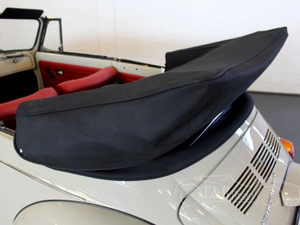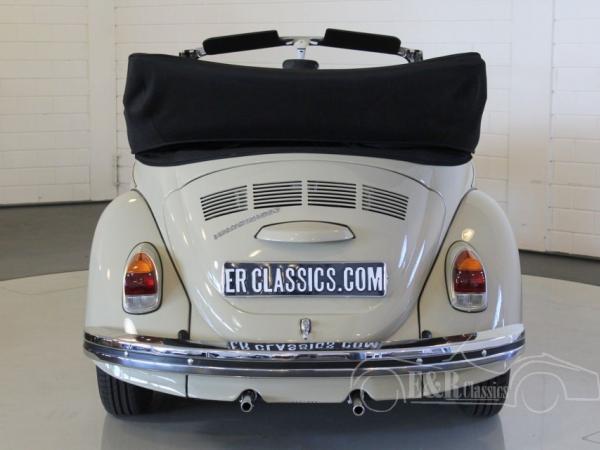 This fully restored Volkswagen Beetle 1500 has marvellous Savana Beige paint with a black mohair soft top. The convertible has the original and fully revised 1500 engine. The car also has disc brakes. The interior has comfortable red leather upholstery with the dashboard in the beige paint colour, a really great combination.