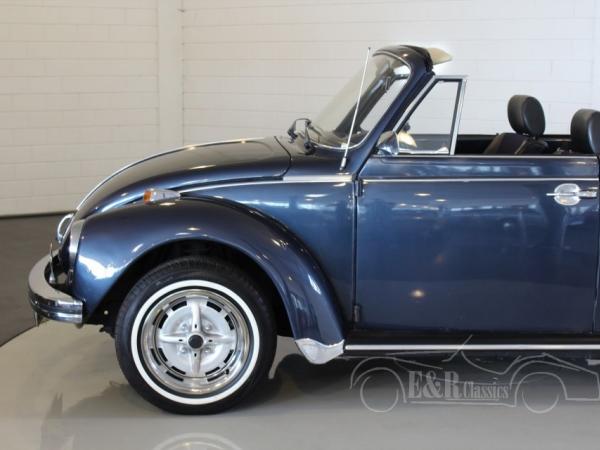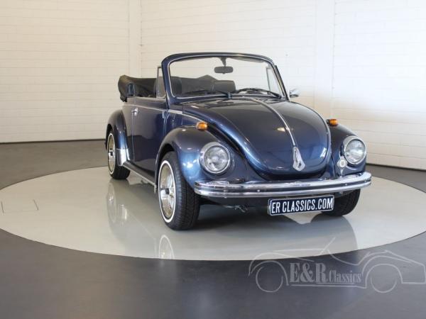This 1974 Volkswagen Beetle has a fabulous blue paint with a lot of chrome details. The interior has the original dashboard with a big combi clock and black leatherette upholstery. The Volkswagen has an automatic gearbox. The Beetle convertible is a very popular classic car which drives great.