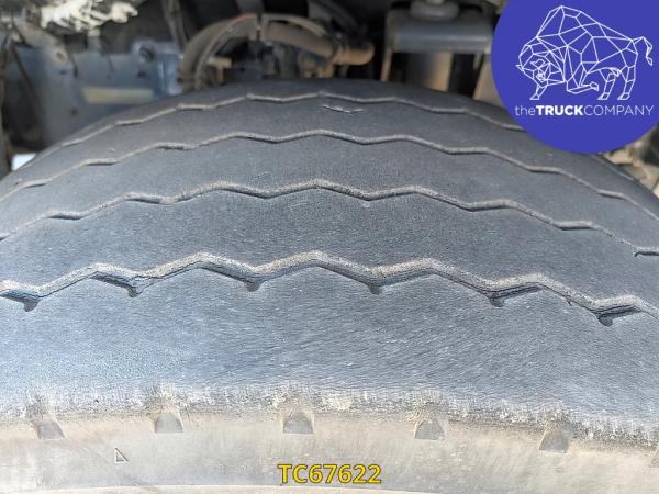 Achteras: Bandenmaat: 315/70 R22.5; Dubbellucht; Bandenprofiel linksbinnen: 5 mm; Bandenprofiel linksbuiten: 7 mm; Bandenprofiel rechtsbinnen: 4 mm; Bandenprofiel rechtsbuiten: 4 mm
