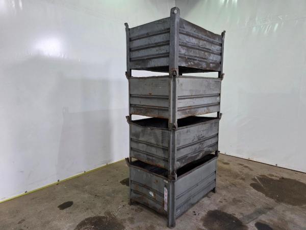 Steel stacking containers suitable for storage and transport in warehouses, workshops, or industry.