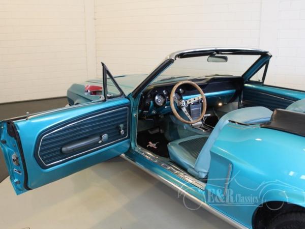 In 1968 delivered Ford Mustang cabriolet in the beautiful Brittany Blue paint with original chrome.The car drives great thanks to the V8 engine and the optional power steering. The car has a black leatherette power top. The interior has blue leatherette and dashboard with aluminium details and wooden steering wheel.