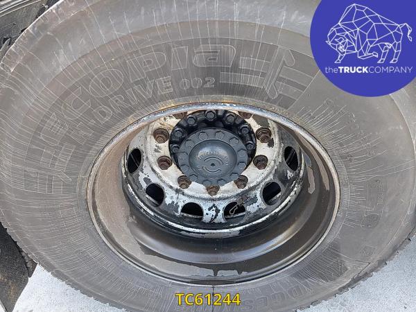 Achteras: Bandenmaat: 315/80 R22.5; Dubbellucht; Bandenprofiel linksbinnen: 7 mm; Bandenprofiel linksbuiten: 8 mm; Bandenprofiel rechtsbinnen: 8 mm; Bandenprofiel rechtsbuiten: 7 mm; Vering: luchtvering