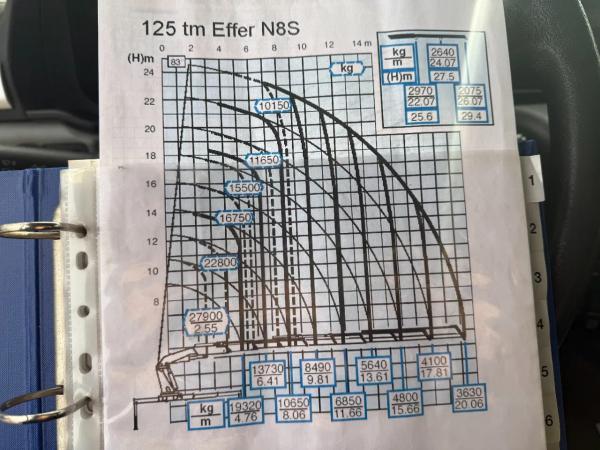 Kraan: EFFER 1250N8S + JIB 2K6SC6P, achter de cabine