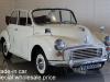 This is a 1957 Morris Minor 1000. The car has white paint and a new burgundy red softtop. The interior has an original metal dashboard in the colour of the paint with a clock in the center. The seats have burgundy red leather with white piping. The Morris has a manual gearbox and drives, brakes and shifts gear very well.