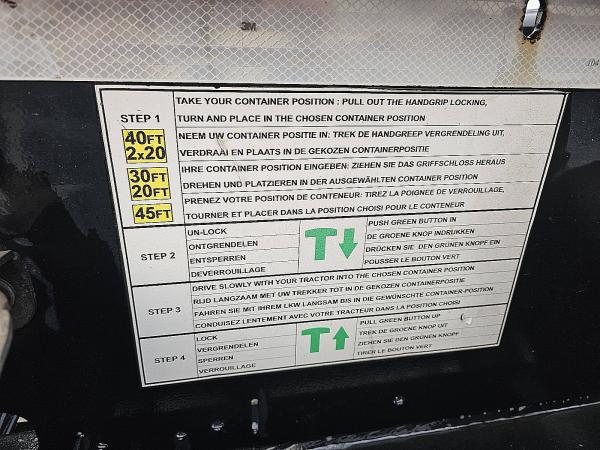 Aantal Assen: 3, Laadvermogen: 37400 kg, Eigen gewicht: 5600 kg, Totaalgewicht: 43000 kg, Soort chassis: Volledig chassis, Materiaal chassis: staal, Kingpin afmeting: 2 inch, Vering type: luchtvering, ABS (Anti Blokkeer Systeem), EBS, Bouwjaar opbouw: 2021, Twistlocks: 2x20 + 1x30 + 1x40 + 1x45 high cube, Uitschuifbare chassis: midden / achter, Merk as: OTHER