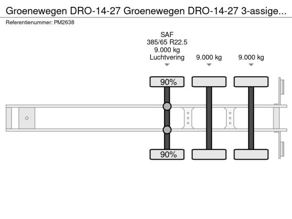 Groenewegen DRO-14-27 Pritschenanhänger aus dem Jahr 2009, ausgestattet mit 3 Achsen, SAF-Achsen, Scheibenbremsen und Luftfederung.