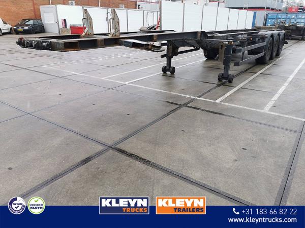 Aantal Assen: 3, Laadvermogen: 34600 kg, Eigen gewicht: 4400 kg, Totaalgewicht: 39000 kg, Soort chassis: Volledig chassis, Materiaal chassis: staal, Kingpin afmeting: 2 inch, Lichtmetalen velgen, Vering type: vollucht, ABS (Anti Blokkeer Systeem), EBS, Bouwjaar opbouw: 2008, Maten container: 1X 40 / 1X45 FT, Merk as: SAF